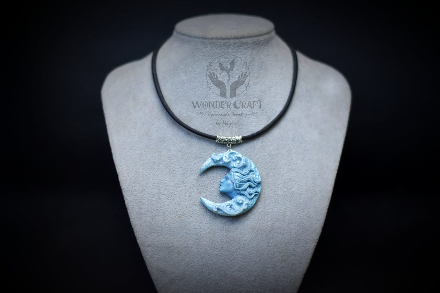 This handcrafted crescent moon pendant glows with soothing blue hues, cradling the peaceful face of a celestial goddess. A symbol of intuition, serenity and feminine energy, it captures the quiet magic of the moon and the power of the divine feminine.