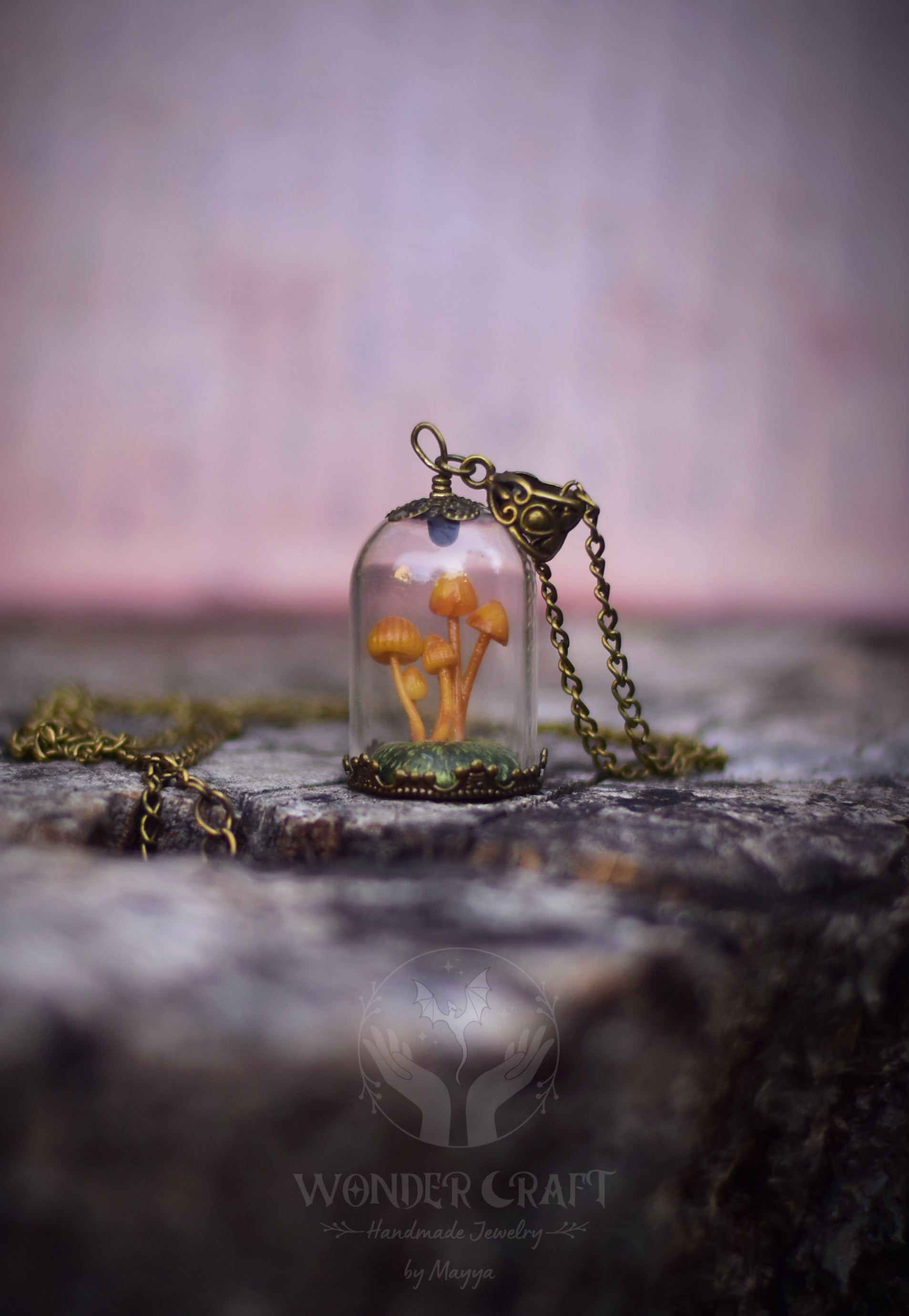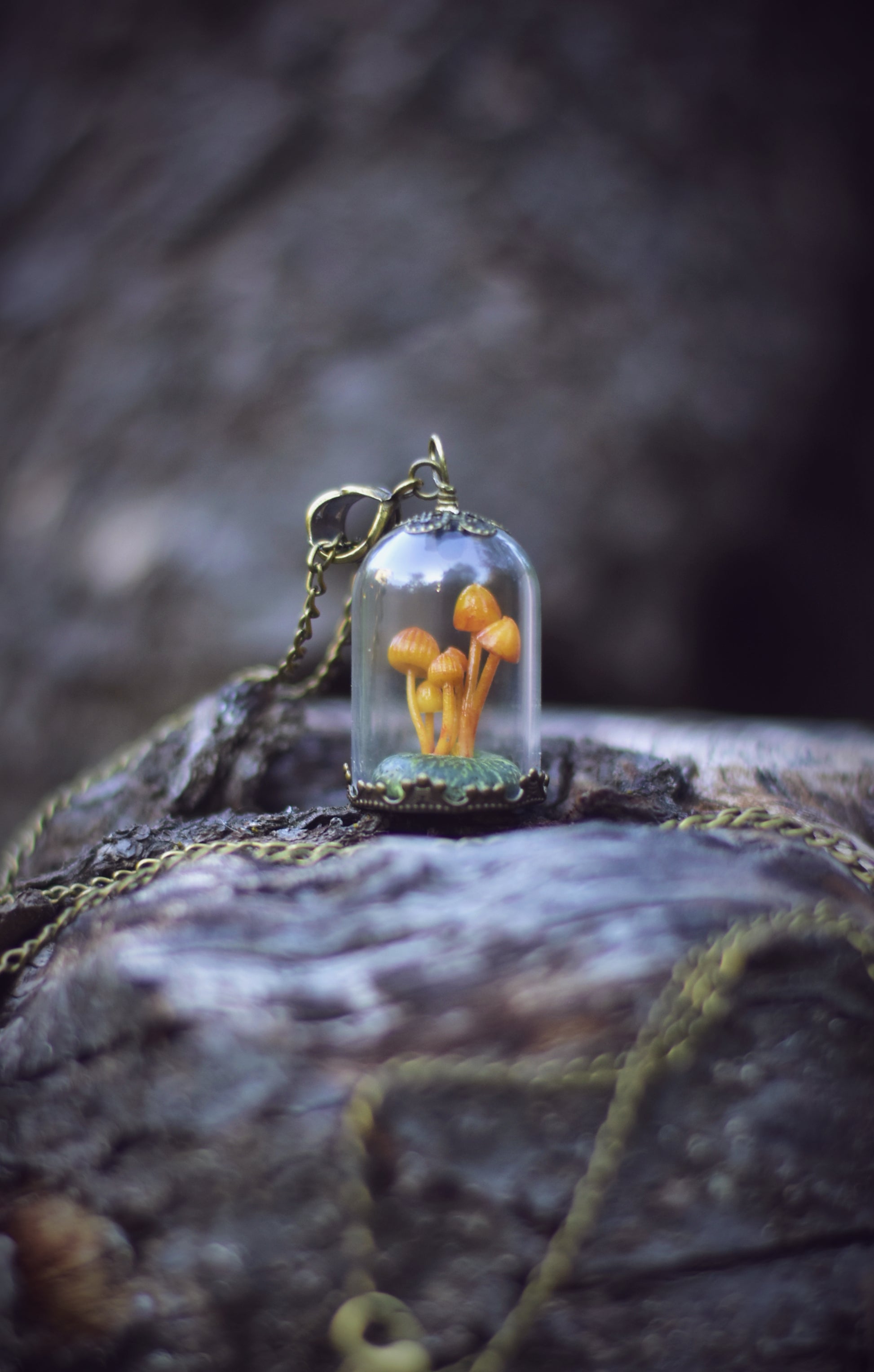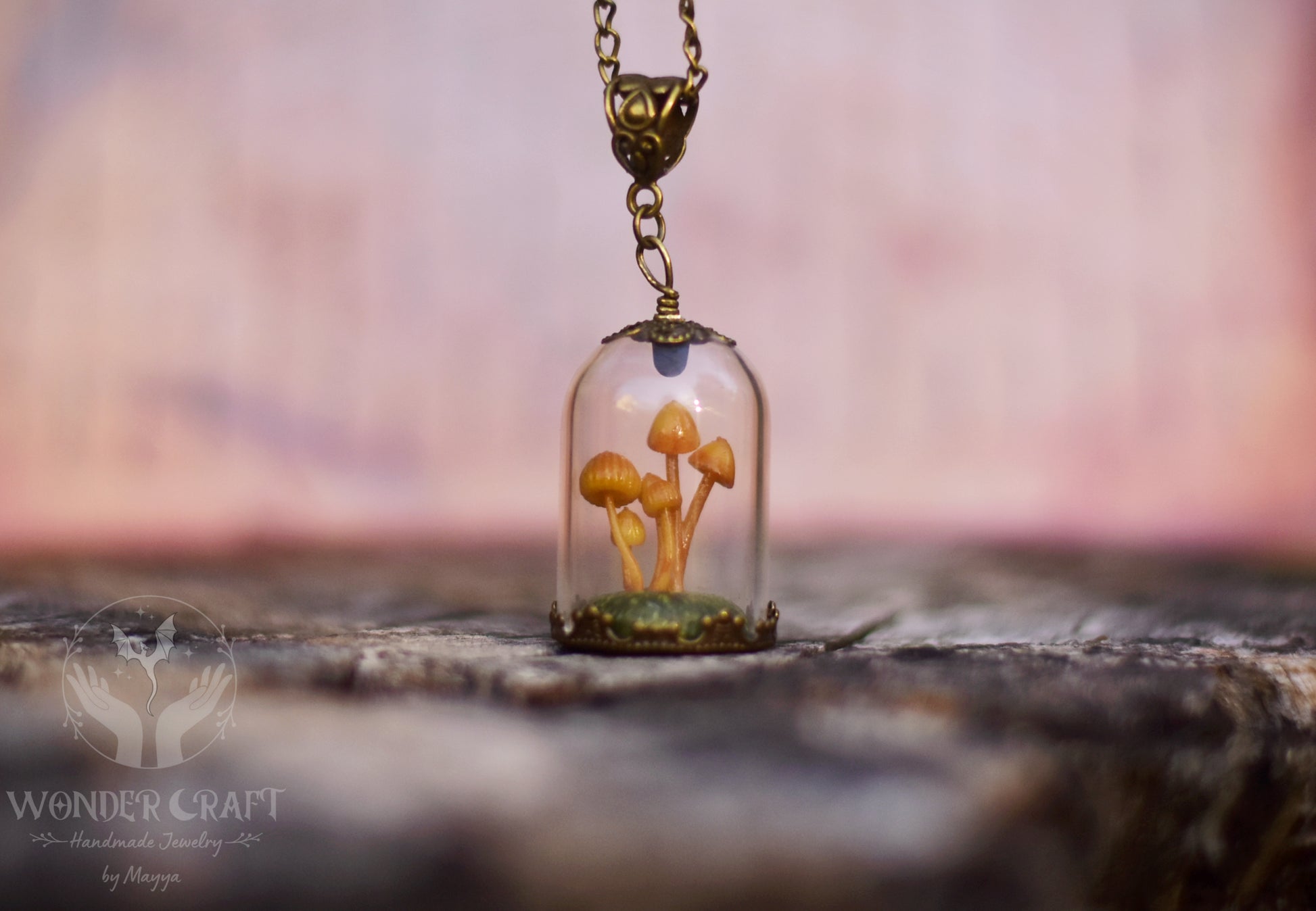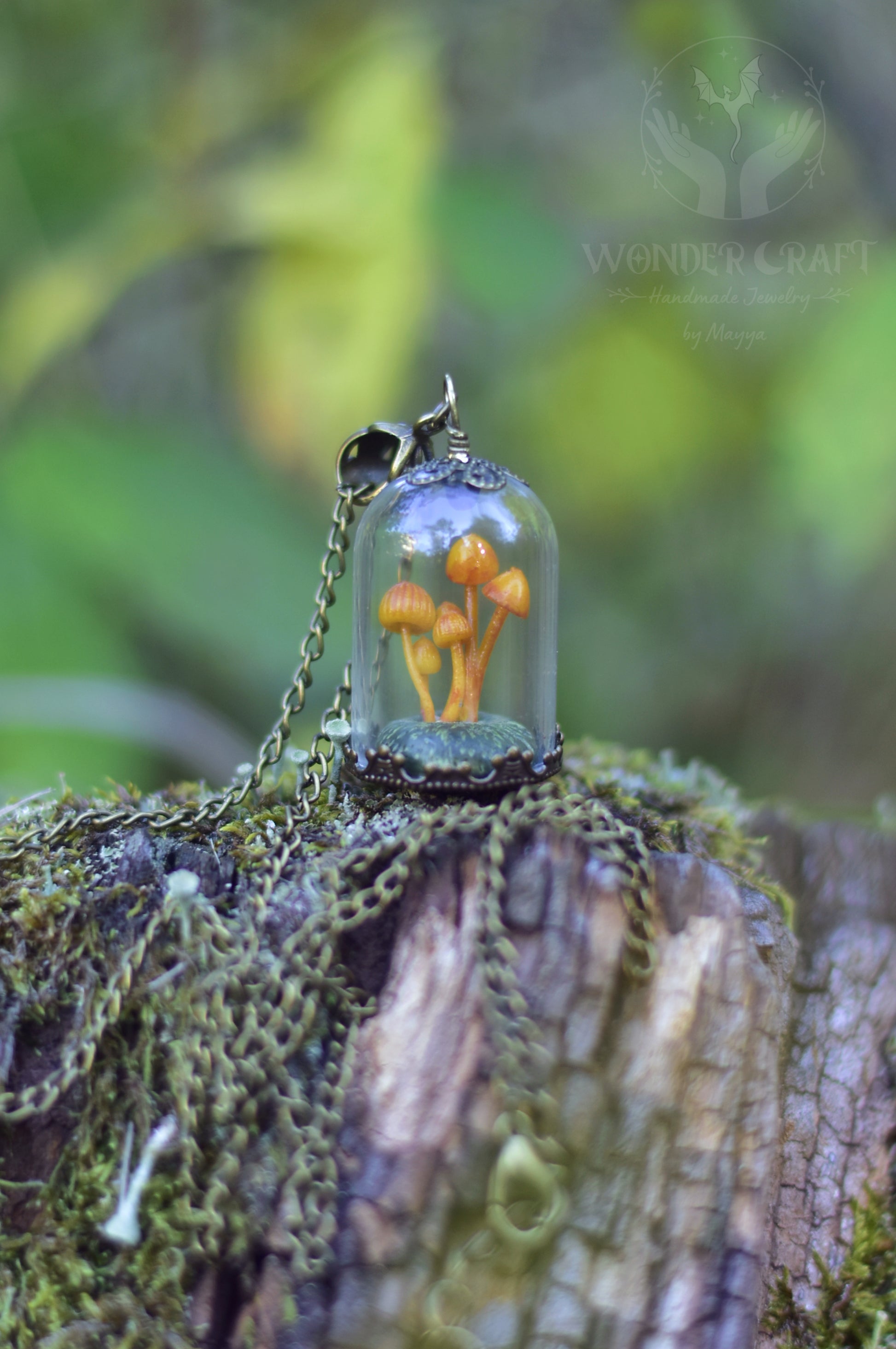 Mushroom Grove Under Glass Dome Necklace and Earrings