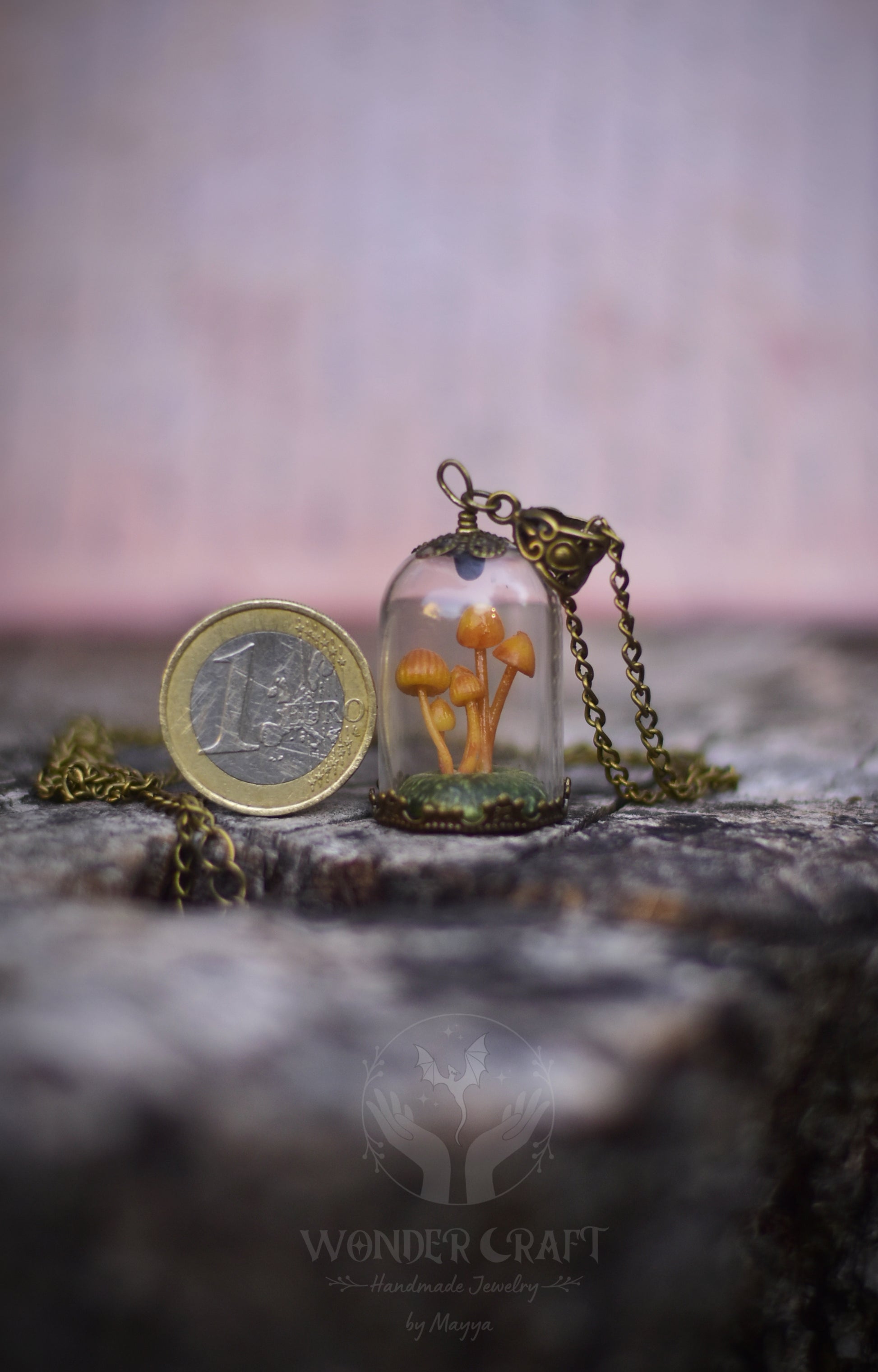 This necklace features miniature yellow wild mushrooms nestled beneath a delicate glass dome. Perfect for nature lovers, it captures the charm of the forest, adding a whimsical touch to any outfit. It comes with a pair of earrings featuring miniature autumn leaves, making it the perfect accessory for the fall season.